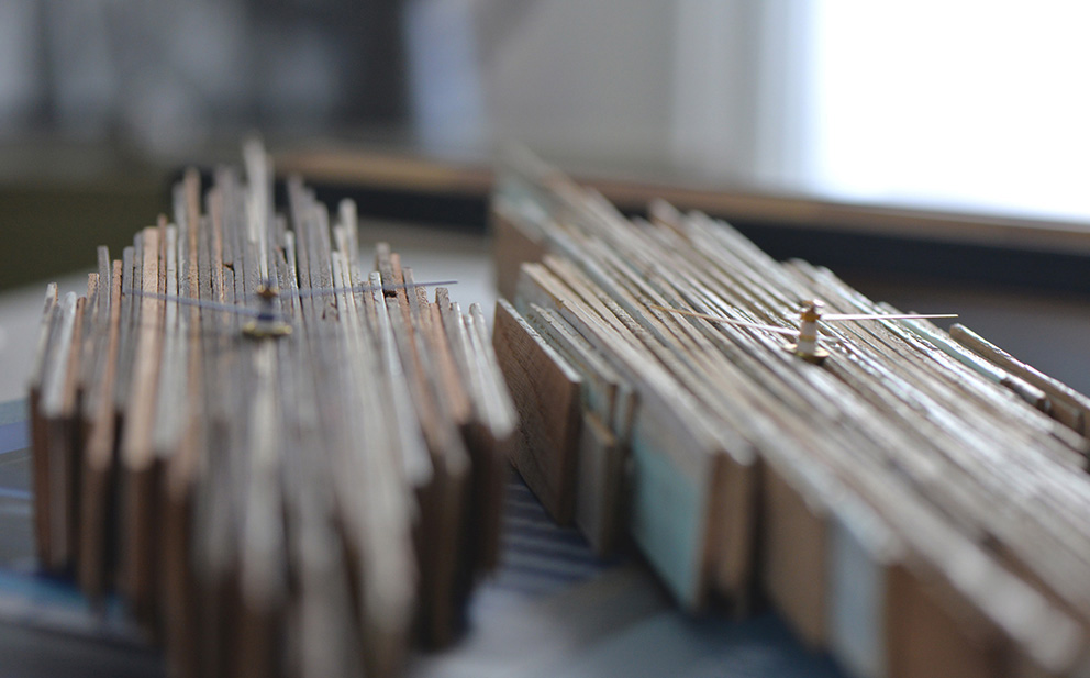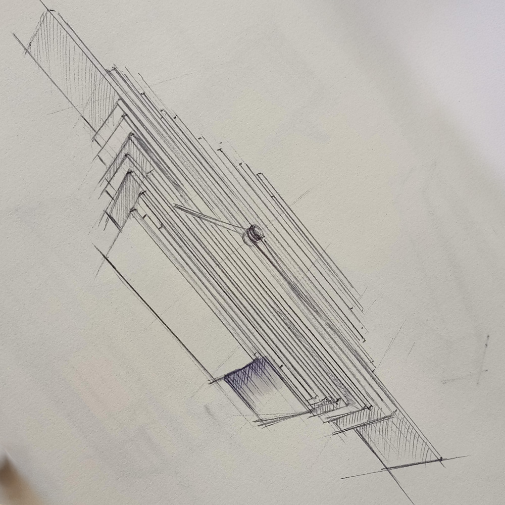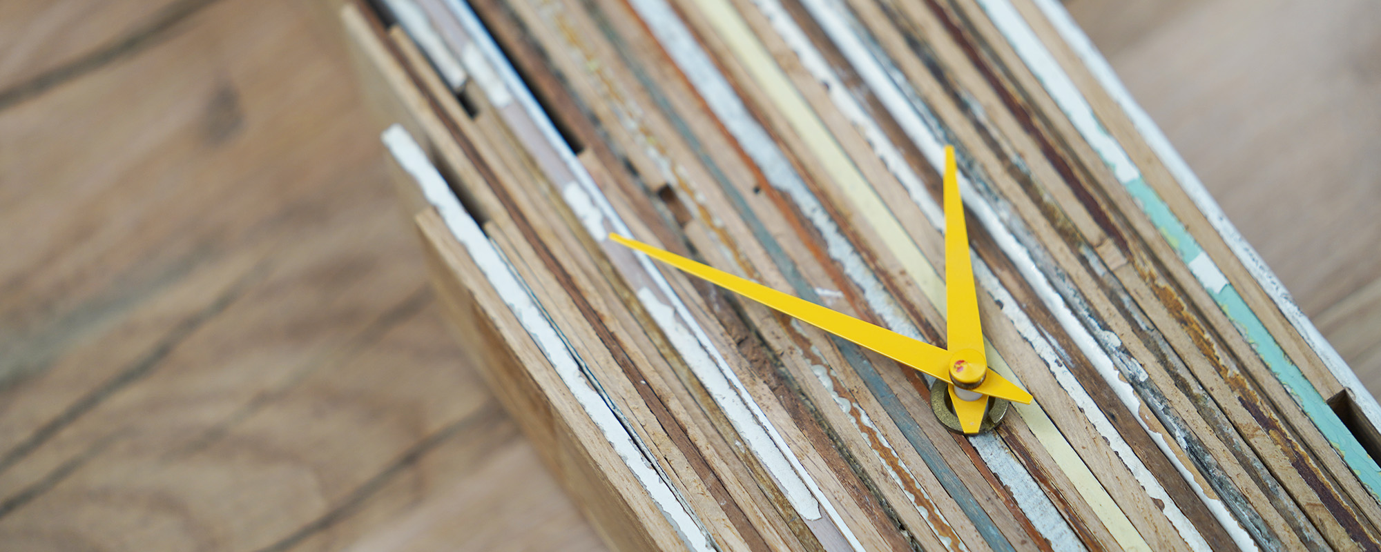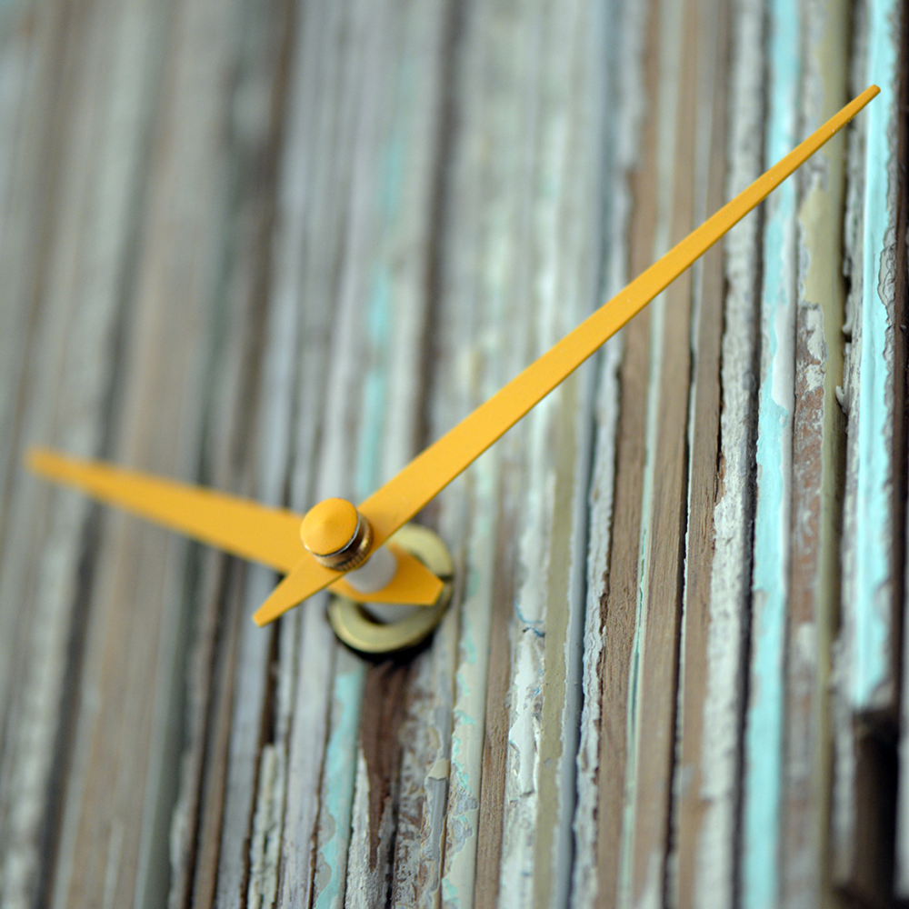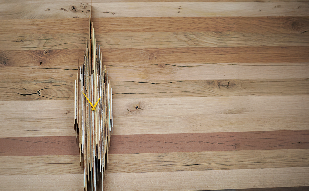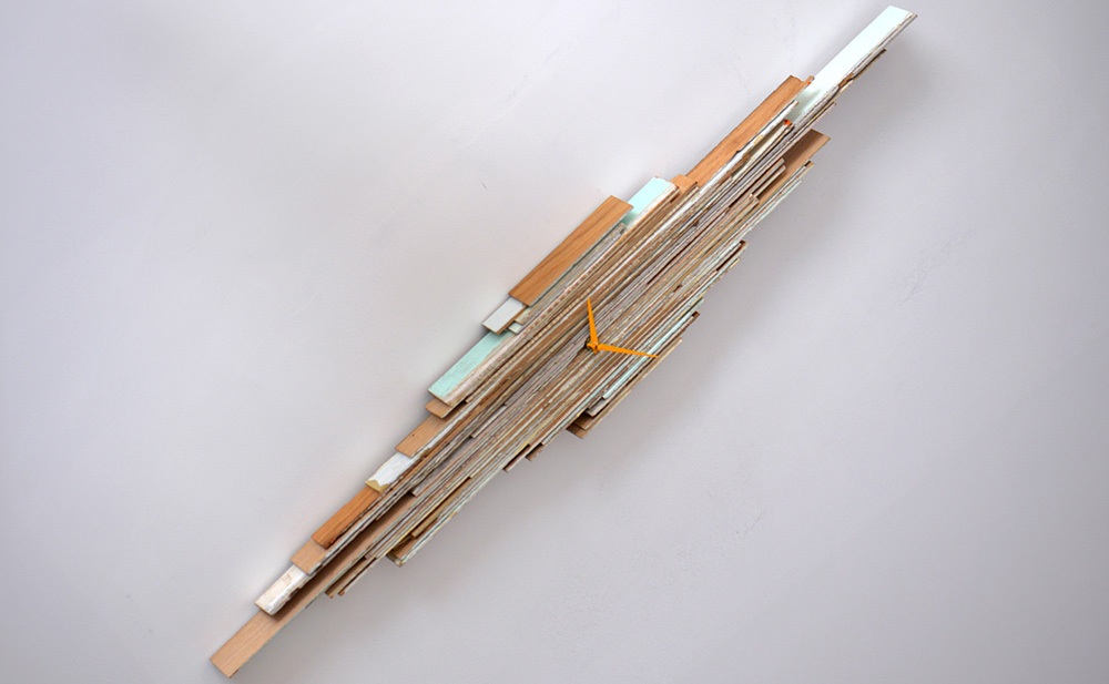 Des lamelles de profils de fenêtre découpées, assemblées, aux coloris uniques architecturent le temps.