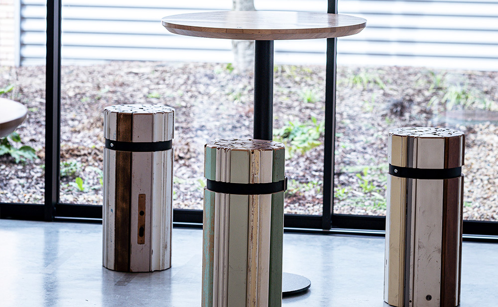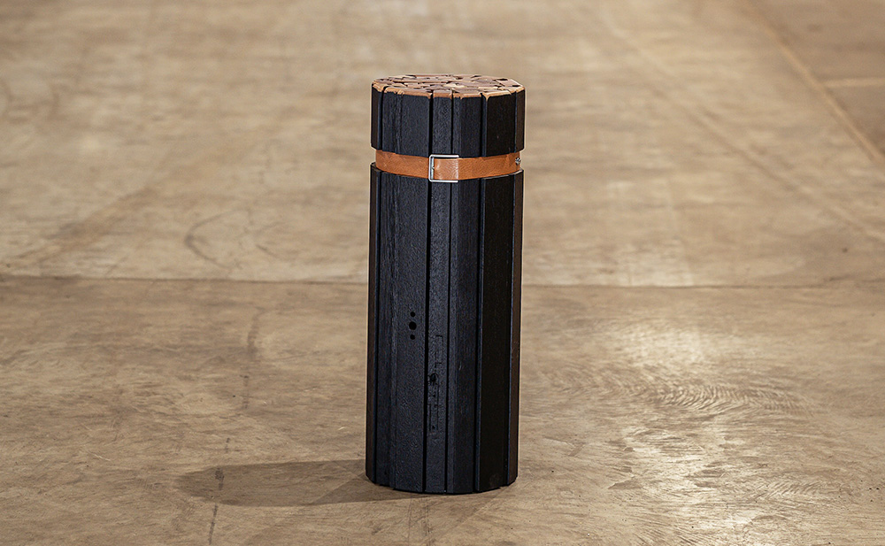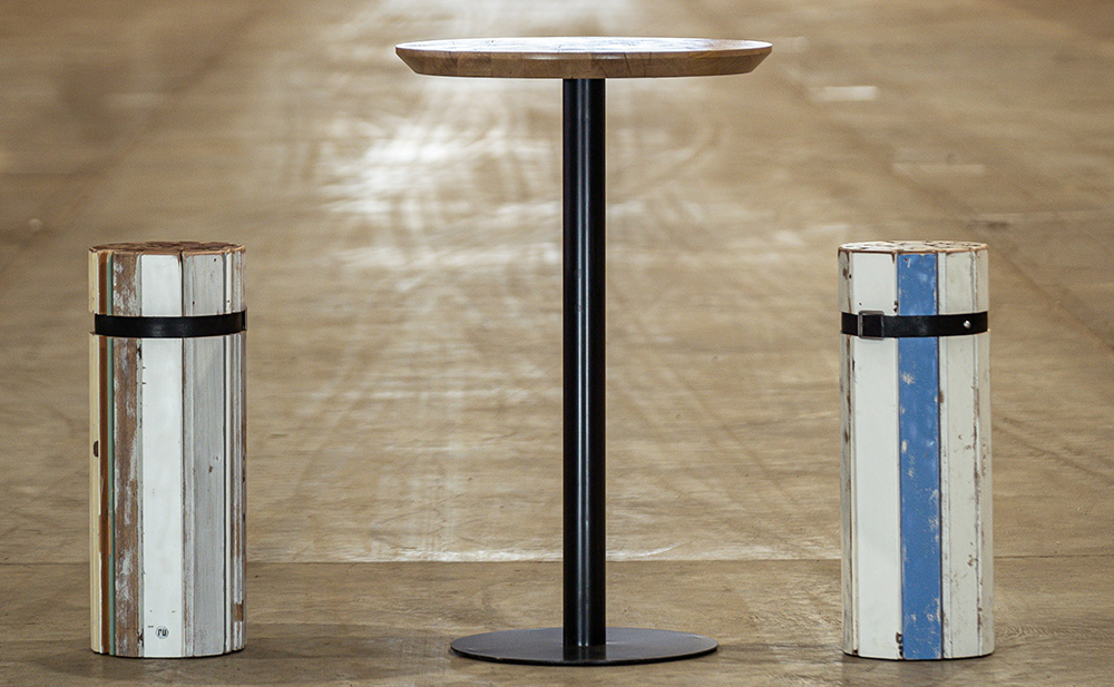 Constitués de profils assemblés pointés, cerclés d’une sangle métallique et d’une ceinture en cuir. Une platine en métal stabilise la base du tabouret ou de la table. Un revêtement anti-rayure assure une protection des sols et un déplacement facile.